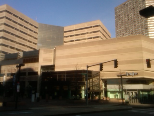 Copley Place consists of multiple connected buildings. Here is a picture of a pedestrian bridge over Stuart St.